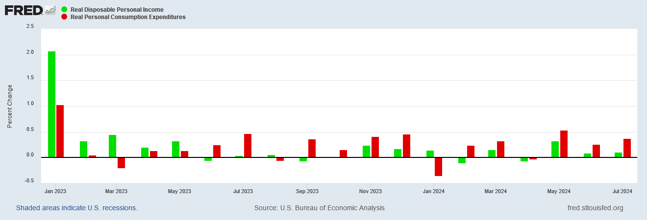 Specifically, what worries Ms. Leonhardt is the rise in real personal consumption expenditures over real disposable personal income since the start of 2024.