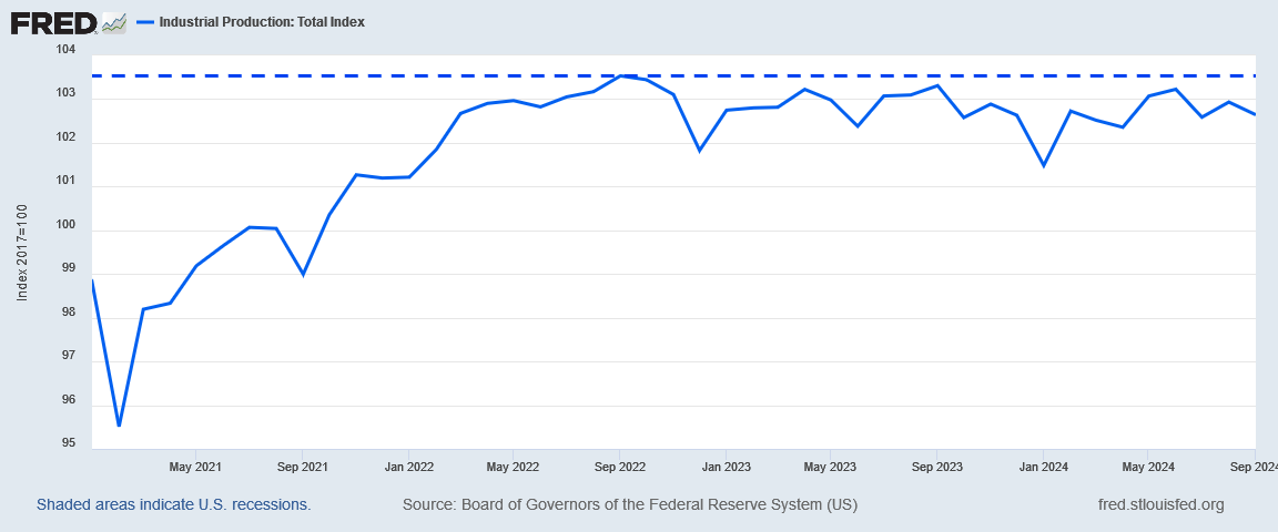 Nor is this the only sign of manufacturing decline. Industrial production in this country peaked in September of 2022 and has trended down ever since.