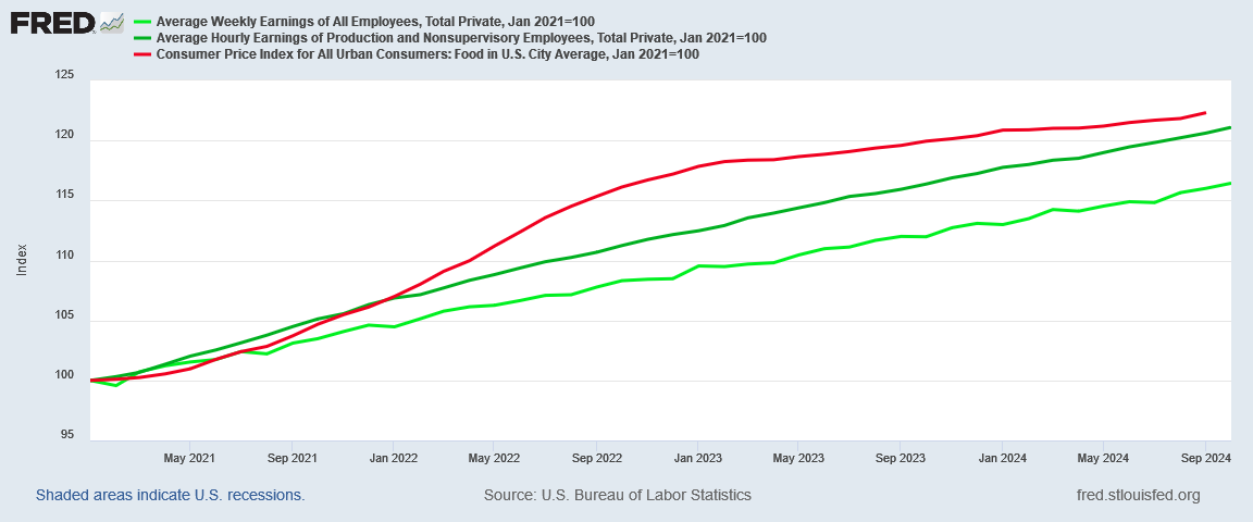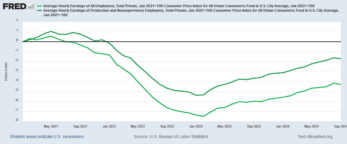 Even using the higher nonsupervisory wage metric, the average household still has not recovered from 2022’s hyperinflation, and are still having to spend more to buy the same groceries.