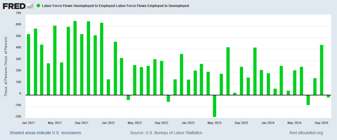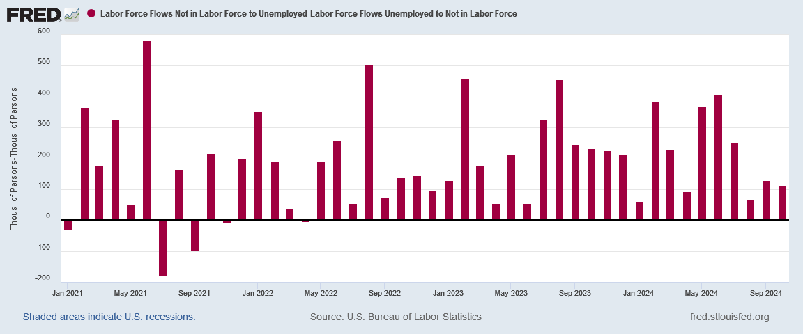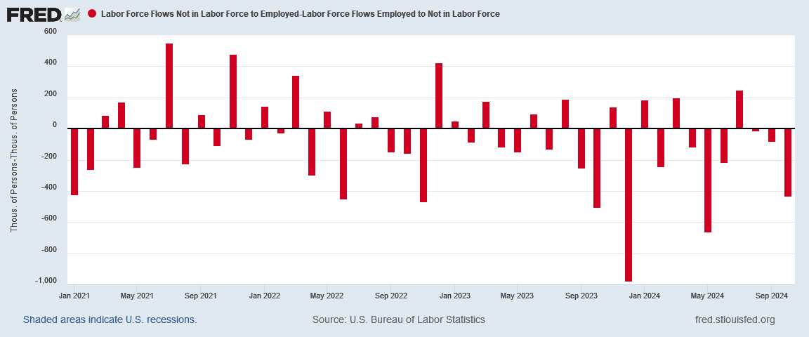 Every month where the difference labor flows to and from employment and not in the labor force is negative is a month where the net flow was of workers out of the workforce.