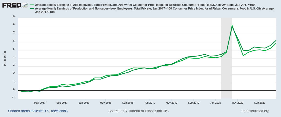 To illustrate the impact of this, if we chart that differential between consumer prices and wages, using the Consumer Price Food subindex for the inflation metric, we can directly measure how much the rising cost of the prototypical food budget has impact the average paycheck.