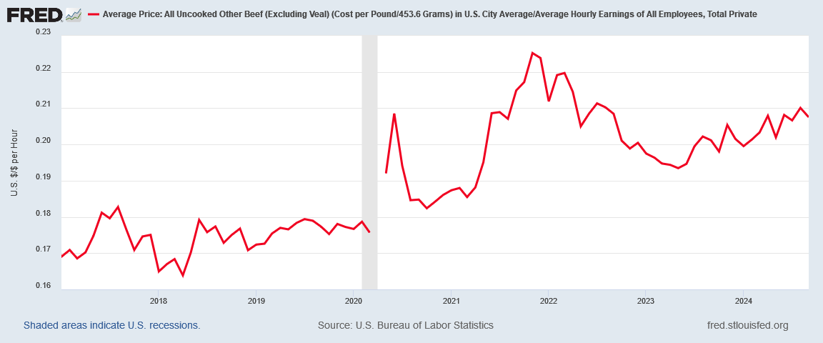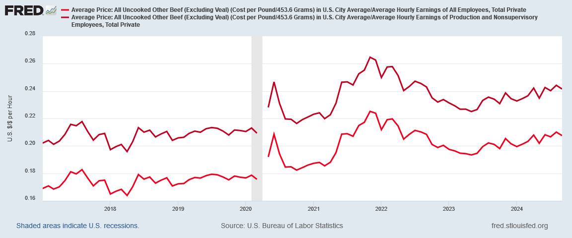 Referring back my earlier article on the topic, consider the labor cost for beef using the average hourly earnings wage metric.