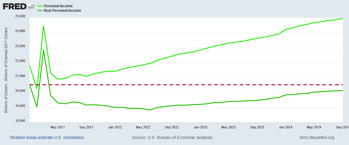 When Real Personal Income for the US stood at an aggregate $20,516.5 Billion in January 2021, but has since declined to $20,130.6 Billion as of September 2024, how is that a healthy economy?