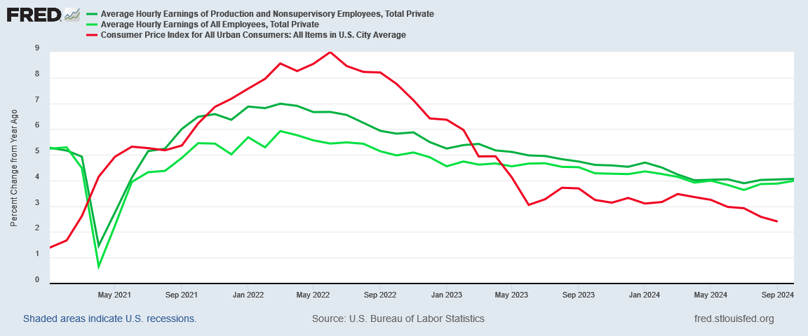 While consumer price inflation year on year outpace them both, nonsupervisory wages rose by approximately a percentage more as inflation was heating up, and maintained a higher rate of increase longer than the broader average hourly earnings metric.