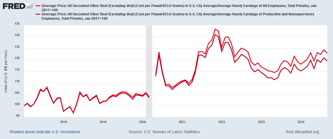 Using nonsupervisory wages, the labor cost for beef since 2017 increased by “only” 19% instead of 22%—not even an additional burger bite at current prices.