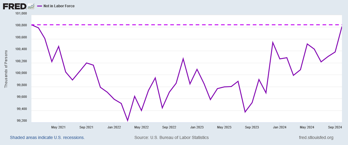 However, not everyone who falls into the “Not In Labor Force” demographic emerges from it, and thus we see rising numbers in that demographic.
