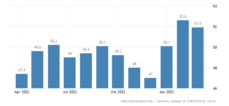 This comes on the heels of the PMI published by China’s National Bureau of Statistics showing the manufacturing sector declining to 51.9—still technically expansive but showing significant weakness from the previous month.
