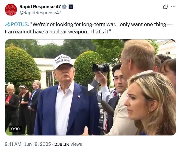 It would be folly to rule out such an outcome, but we should also note that President Trump’s position has been focused and explicit: Iran cannot obtain nuclear weapons. Beyond that, Trump has explicitly declaimed any desire for a protracted war with Iran.