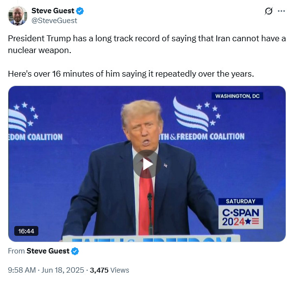 As many on X have noted, President Trump has been explicitly opposed to Iran obtaining nuclear weapons, and his position that Iran’s enrichment activities are a nuclear weapons program in violation of the NPT predates his first term as President.