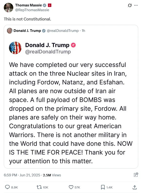 As I noted last night, contrarian Republican Thomas Massie posted on X that he did not deem the attack to be Constitutional.