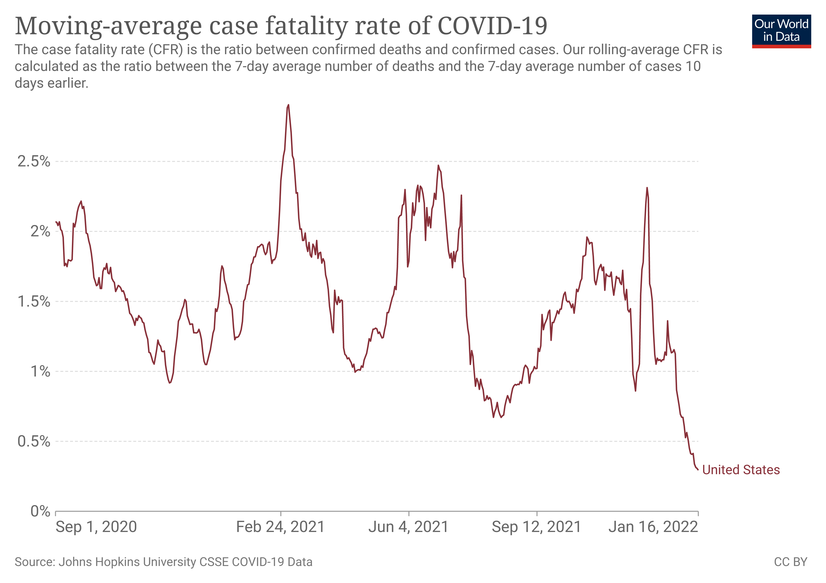 Dr. Ray's warnings about future variants being more rather than less deadly is not only contrary to this historical assertion about viral evolution, it also is contrary to what the data has shown over time. As I discussed in the fall of 2020, subsequent waves of COVID-19 infection have, by and large, been generally less virulent and less lethal. This trend has certainly been the case in the United States even through the Omicron wave, as successive waves of infection have been marked by successively lower peaks in the case fatality rate.
