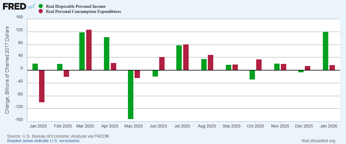 Remarkably, the decline in durable goods consumption occurred during a month when real disposable personal income surged, far outpacing overall consumption.