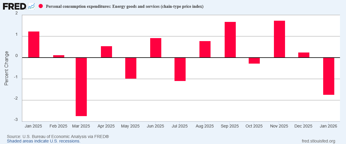 That gasoline prices fell at the pump in January, according to the EIA, arguably kept energy price inflation from heating up.