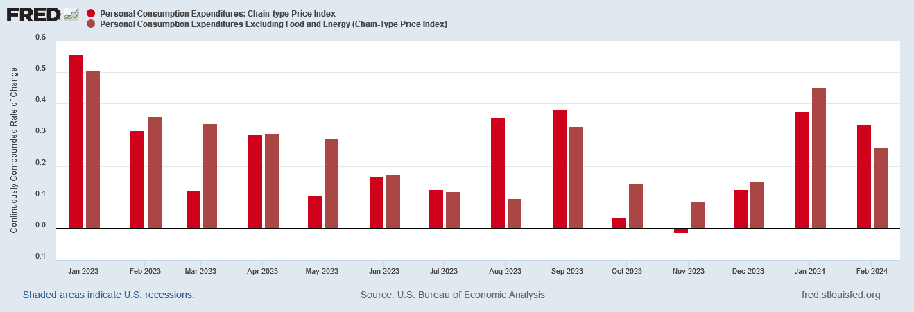 With the Federal Reserve publicly committed to restoring a 2% inflation rate, a rising inflation rate particularly in the PCE means the Fed is not going to be able to credibly reduce the federal funds rate until at a minimum the inflation trend is down and not up. At present, the inflation trend is up, which pushes rate cuts off the table for now.
