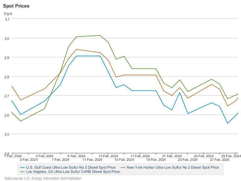 Only diesel prices ended February slightly lower, and that was after a significant uptick in early February.