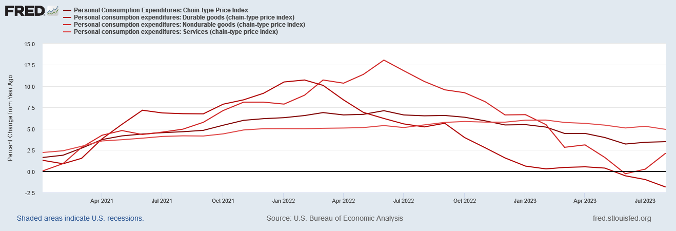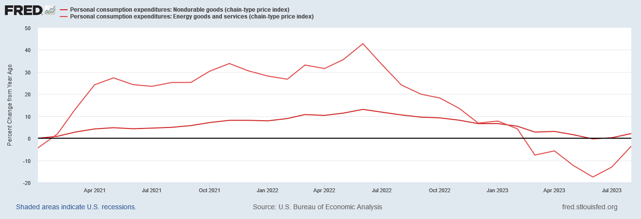 While durable goods have been in a disinflationary/deflationary trend since early 2022, energy prices have been pushing up non-durable goods and service prices, causing inflation to show up there and not elsewhere.