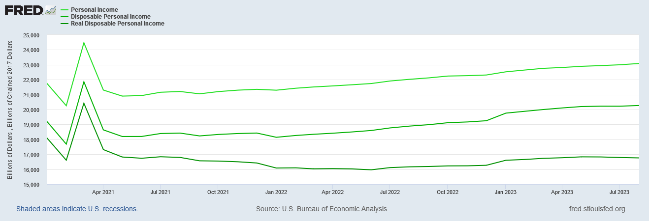 Nominal personal incomes decline sharply early in 2021, and did not recover to January 2021 levels until July 2022. Nominal disposable personal incomes did not recover until December 2022. Real disposable personal incomes have yet to recover—and have been in further decline through July and August.