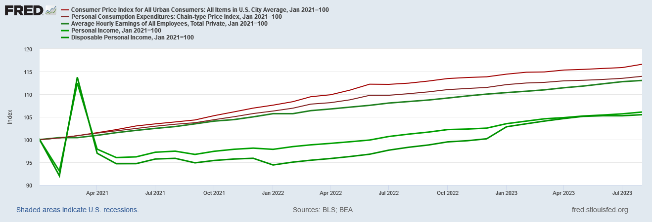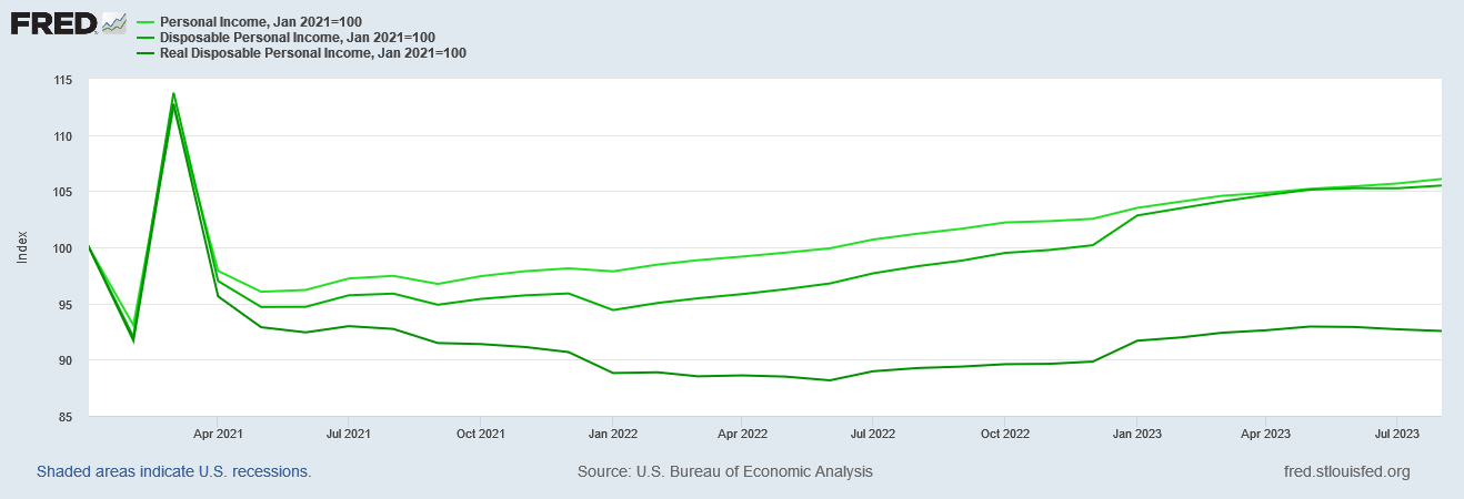 If we index the income data to January, 2021, we get a much clearer view of the magnitude shifts over time, and we begin to see what has actually happened to disposable income (take-home pay) since then.
