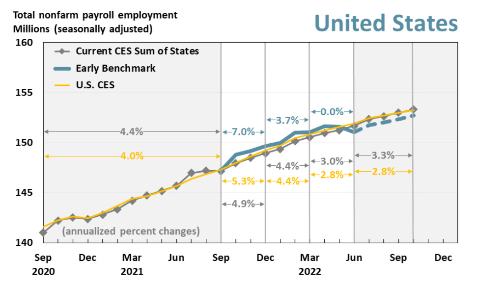 The Philly Fed’s early benchmarks are based on the BLS Quarterly Census of Employment and Wages, which contains more comprehensive payroll and employment information than the monthly Employment Situation estimates (which are based on sampling). The benchmarking revisions performed by the Philly Fed takes that QCEW data—which uses the BLS data with its most recent revisions and updates—to update the BLS annual benchmarks for employment.