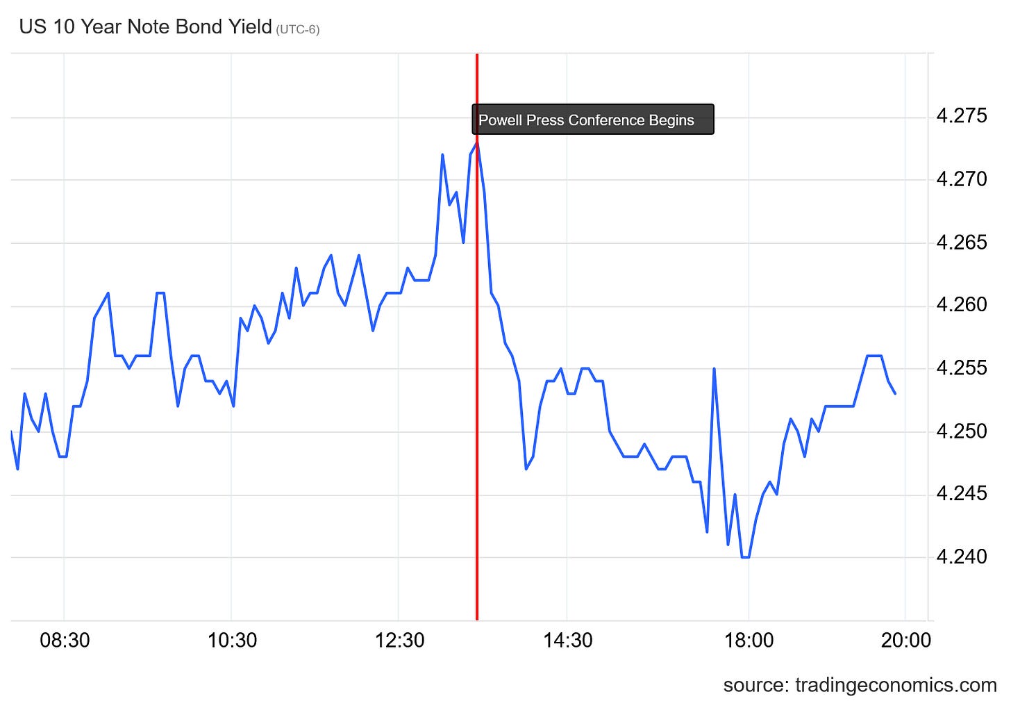 Treasury yields had been rising on the day, reversed when the FOMC press briefing began, and eventually rose again, finishing the day close to the pre-presser peak.