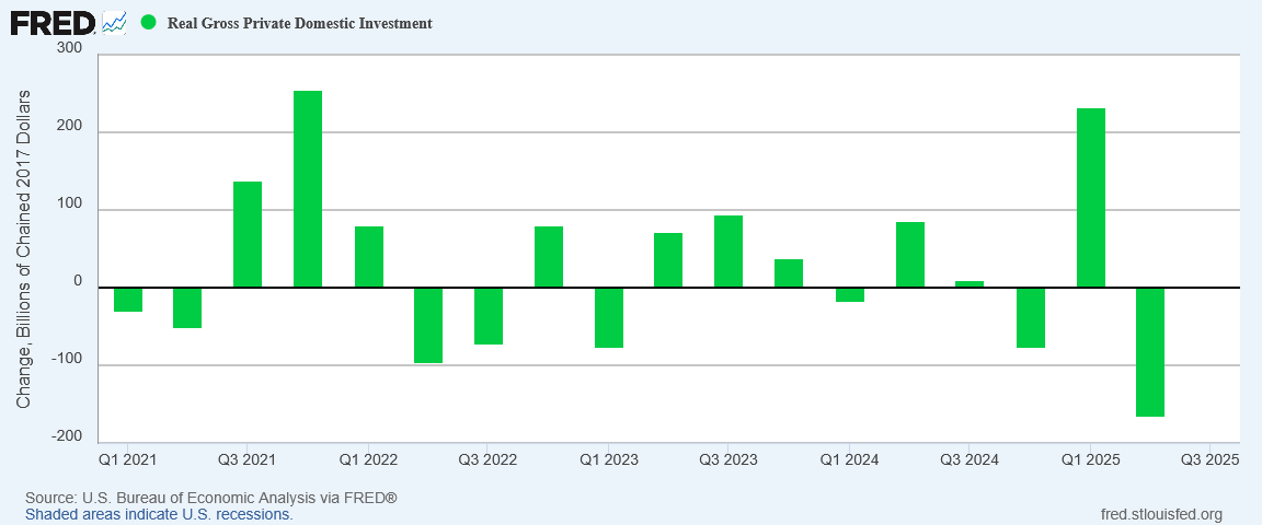 The “expansion” narrative on investment rests entirely on a surge in investment spending in Q1 of 2025. Outside of that one quarter, investment in the US has contracted.