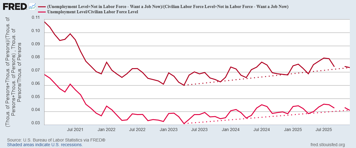 Moreover, the trend in unemployment is clearly rising. We are seeing, over the longer term especially, more joblessness rather than less. That “real” unemployment rate which includes those not in the labor force but who want a job now has been trending up slightly faster than the official unemployment rate.