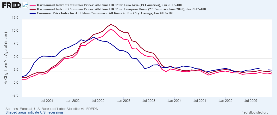 When we look at inflation rates both here in the US and in Europe, we see that, after the 2022 hyperinflation cycle ended, consumer price inflation stabilized in around 2.5%-3%.