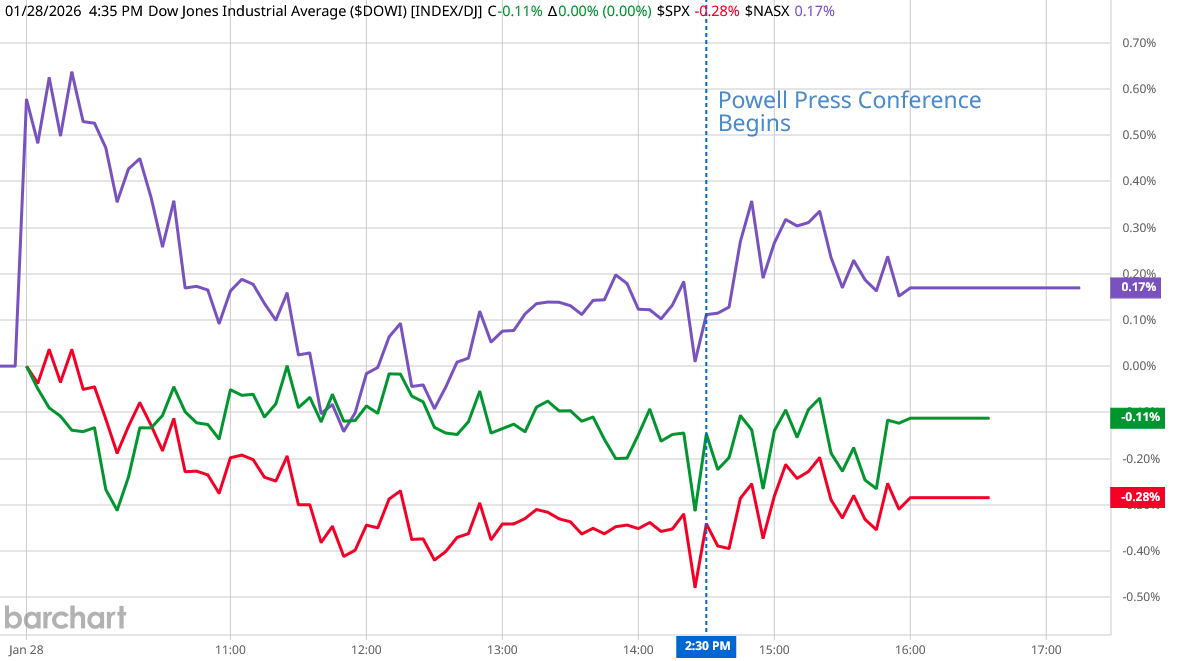 Equities started the day in a similarly pessimistic mood, declining through the morning before rising in the afternoon, reversed that climb briefly just before Powell began his briefing, then resumed their afternoon rise.