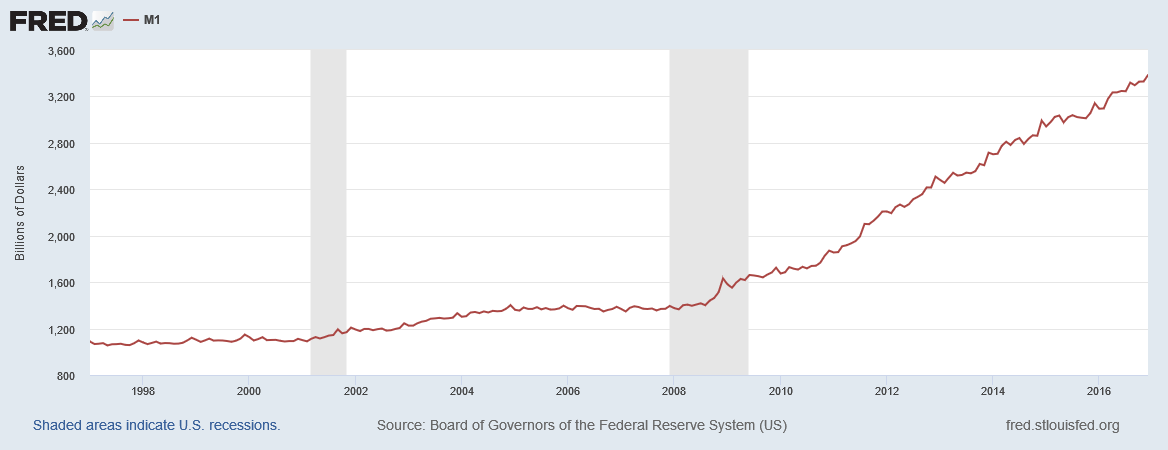 The Federal Reserve responded to the liquidity crisis of 2008 with what was then an unprecedented injection of liquidity into financial markets. Dollars were literally created ex nihilo to allow an orderly unwinding of the collapsing derivative markets, resulting in an increase in the pace of M1 money supply expansion that continued well after the crisis had passed.