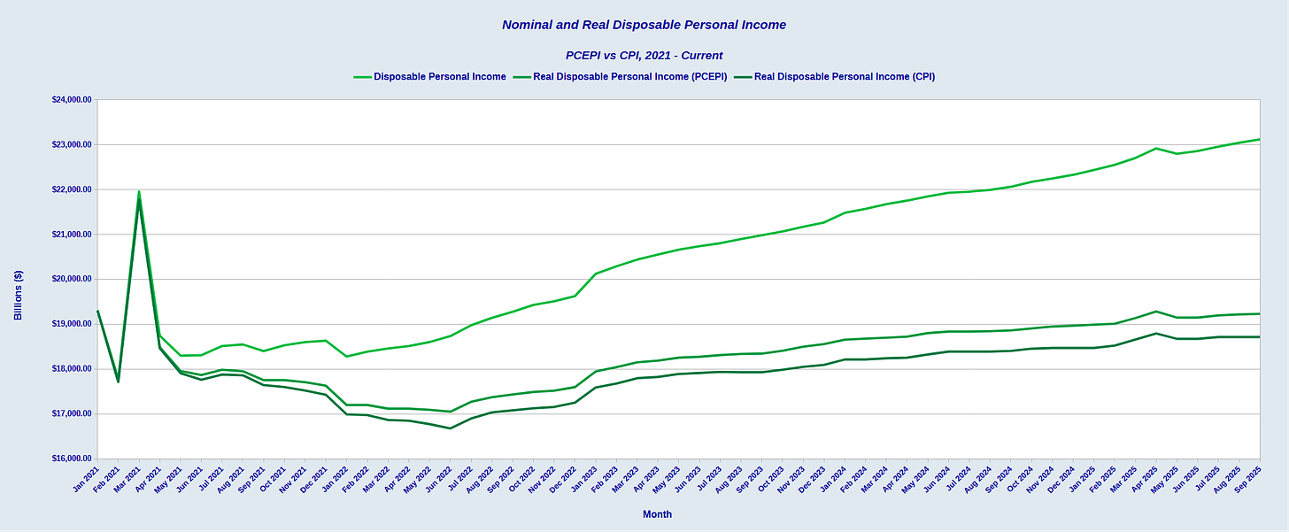 What has “cooled” of late has been real disposable income. When we calculate real disposable income from nominal values using both the CPI and PCEPI indices, we can see how incomes have yet to recover from the body blows they endured during the Pandemic Panic in 2020.