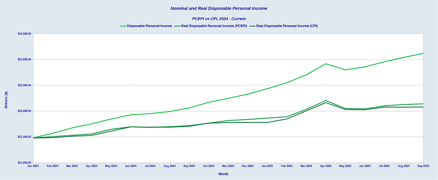 Even more worrisome is that real disposable personal income has actually trended slightly downward since the spring.