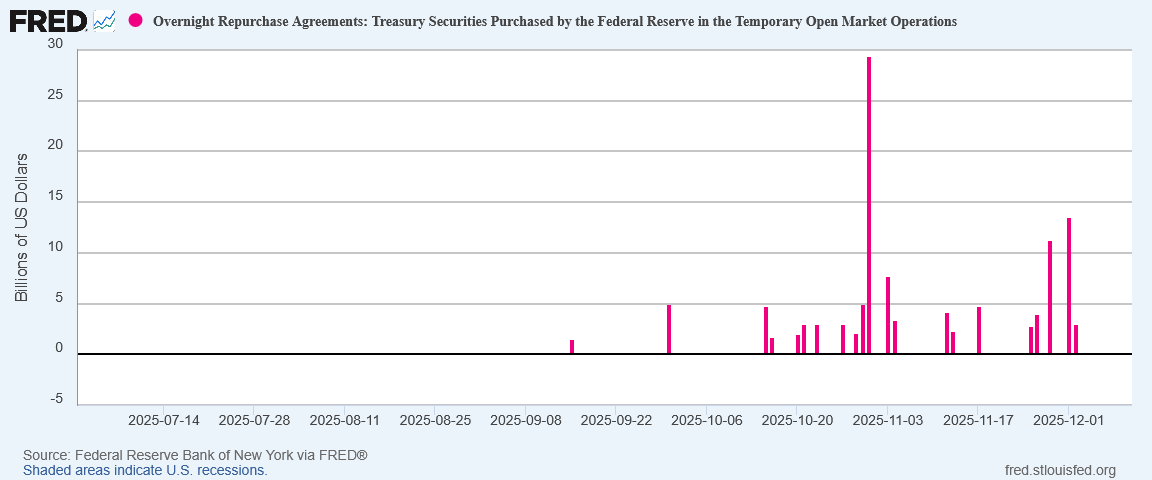 That overnight repo volumes continued to spike even across the Thanksgiving Day holiday weekend is a strong indicator that banks are coming up short on liquidity at crucial moments.