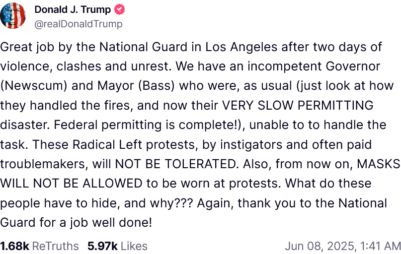 Earlier, Trump posted on Truth Social making it clear that anti-government riots will get a forceful response.