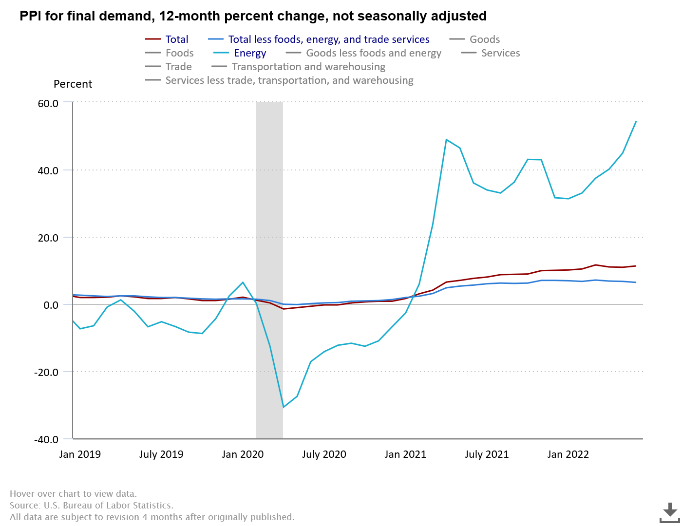 According to the PPI report (Table 1), final demand energy prices rose an unadjusted 54.4% Year-On-Year and a seasonally adjusted 10.0% Month-On-Month.