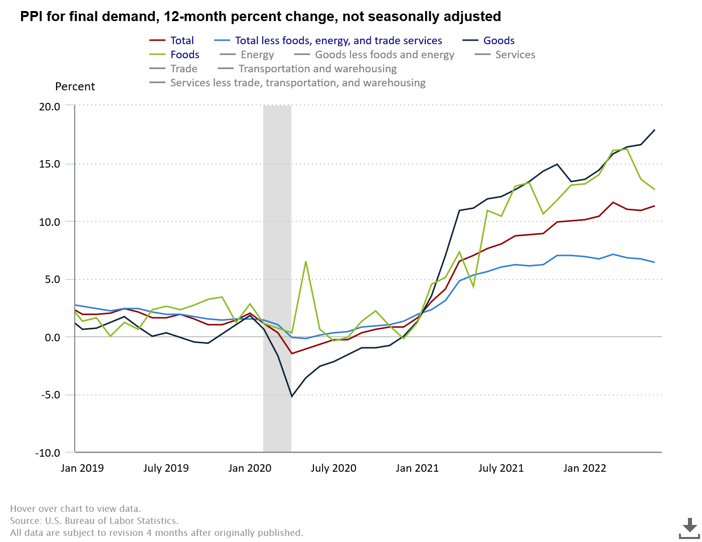 With the release of the Bureau of Labor Statistics Producer Price Index Summary for June, two hopes effectively died: 1) the hope that June’s 9.1% consumer price inflation number represented “peak” inflation, and 2) the hope that the Fed might opt for a rate hike less than 100bps.