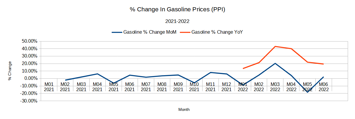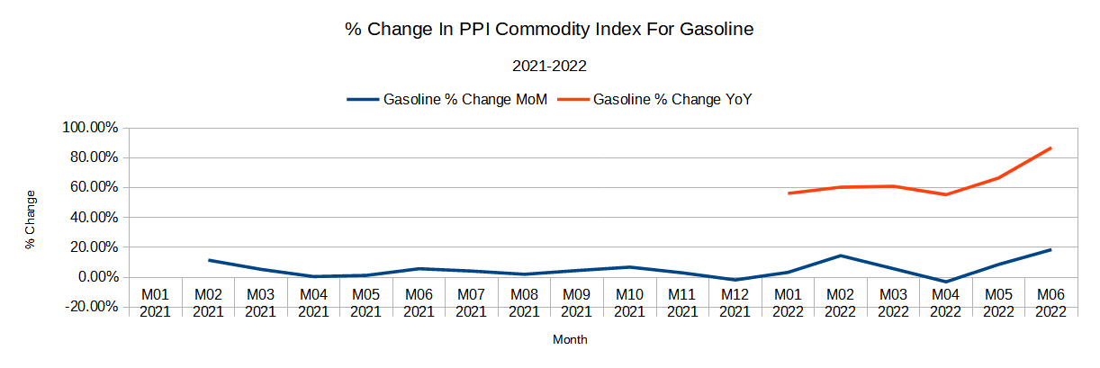 While gasoline producer prices did rise in June, that rise is nowhere near 18.5% Month-on-Month. Nor is the Year-on-Year price increase 86.5%. In actuality, the Year-on-Year increase is just above the monthly reported rise of 18.5%