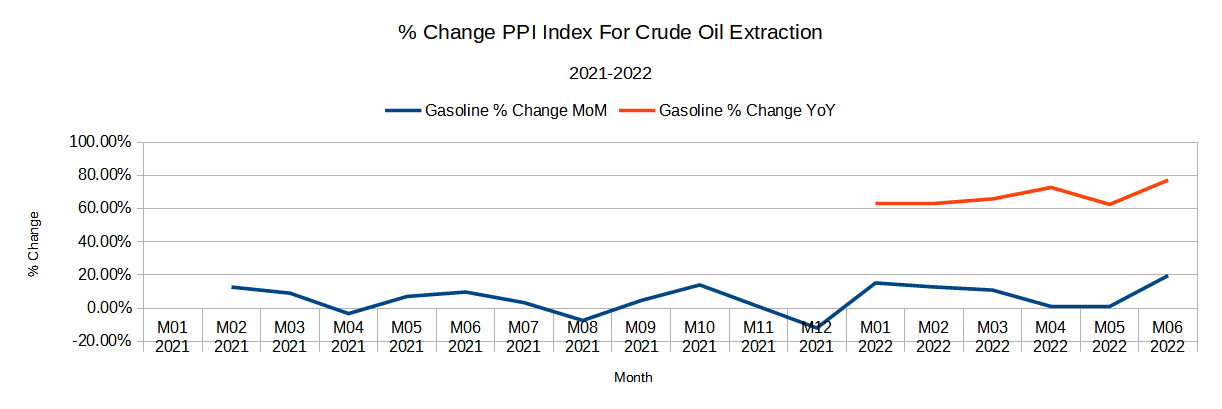 The PPI index for crude oil extraction—the precursor to gasoline—also shows dramatic increases for both the Month-On-Month and Year-One Year changes.