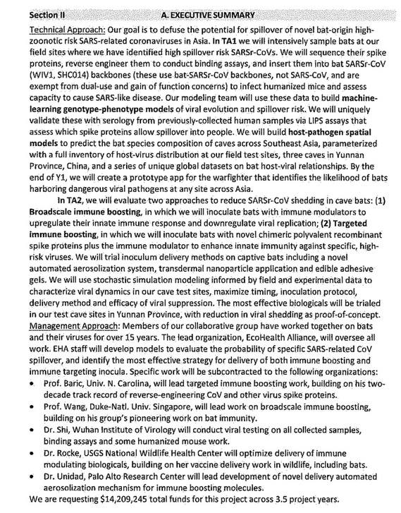Dr. Shi also figured prominently in the EcoHealth “Defuse" project proposal, which proposed, among other things, to infect bats with augmented coronaviruses: