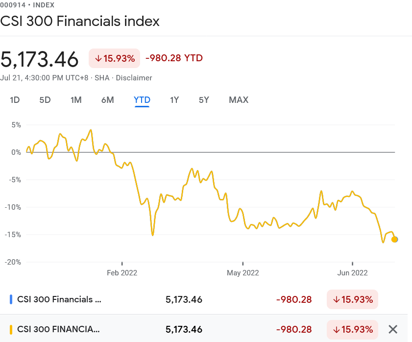 While China’s banking sector has not (yet) reached a point of systemic calamity or collapse, there is no denying that China’s banks have had a rough year thus far. Real estate developer woes, combined with the disruptions and dislocations of the Zero COVID lockdowns (which may be returning once more), have pushed the CSI 300 Financials Index—a leading stock index tracking the performance of China’s banks—down more than 15% on the year.