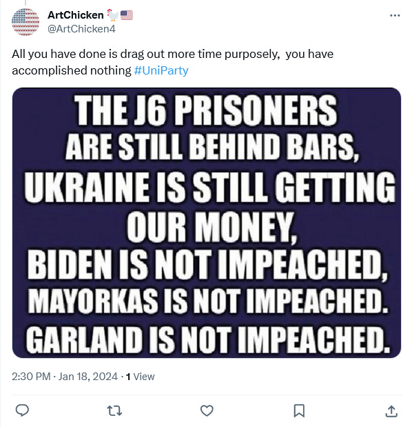 What we do see on X/Twitter in particular is a number of tweets taking aim at what is called the “Uniparty”, the premise that both Democrats and Republicans are in reality merely different heads of the same corrupt political Hydra. That suspicion appears throughout political topics on X/Twitter, such as Congressional efforts to fund both border security and Ukraine’s war effort against Russia.