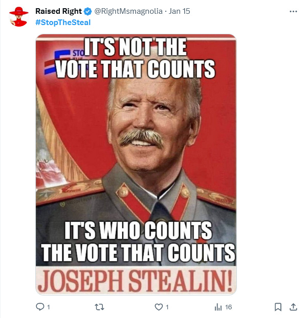 On X/Twitter, for example, a search of the top tweets with the hashtag “#stopthesteal” brings up this tweet from just a few days ago: