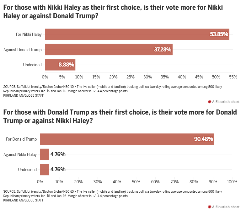 Most tellingly, however, is that for the two leading candidates, Trump and Haley, their supporters are mostly voting for the respective candidate and not against the other.