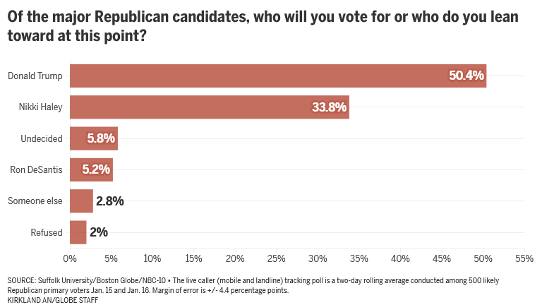 At the same time, Ron DeSantis is the second choice for roughly 30% of New Hampshire Republicans.