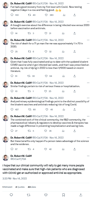 Indeed, Robert Califf’s tweet thread on his COVID experience could pass as paid-for advertising for Pfizer.