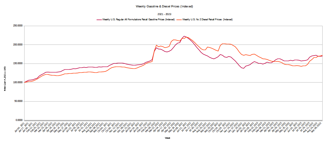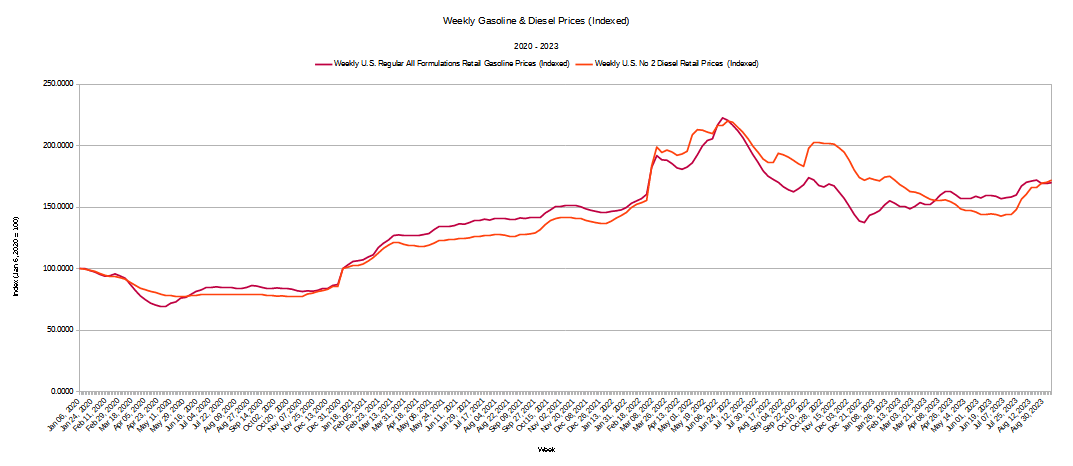 Even with the extended decline in prices at the pump for both gasoline and diesel in the twelve months between June, 2022 and June of this year, when we index those prices to the first week of 2020, we see that gasoline and diesel prices have risen by nearly 50%.