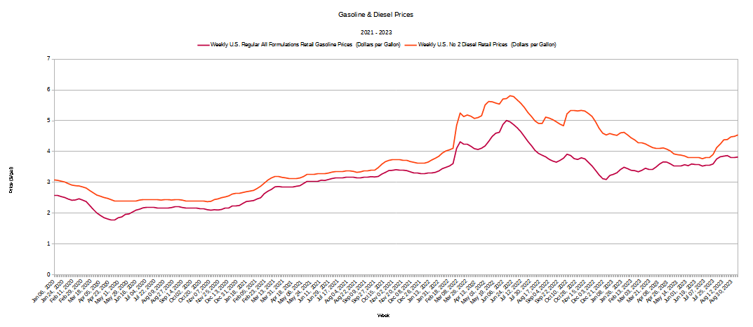 Had the price declines which began in June of last year continued, the overall increase might not have been that significant. However, when diesel prices began rising in July, they were still 42% higher than at the start of 2021, and when gasoline prices began rising last December they were 37% higher.