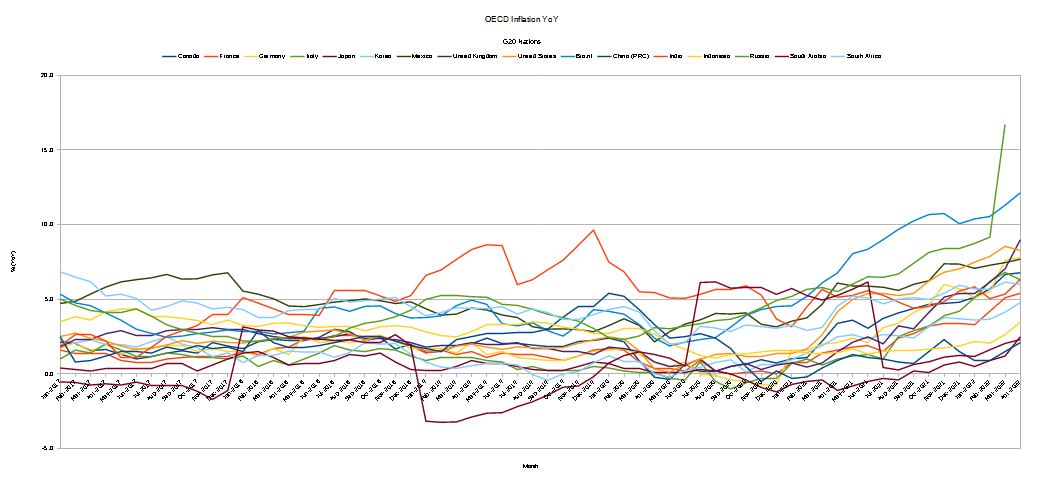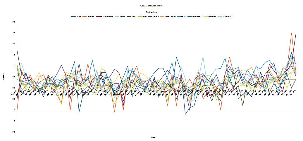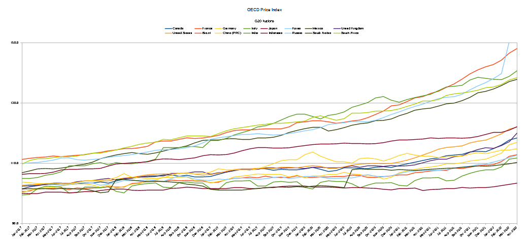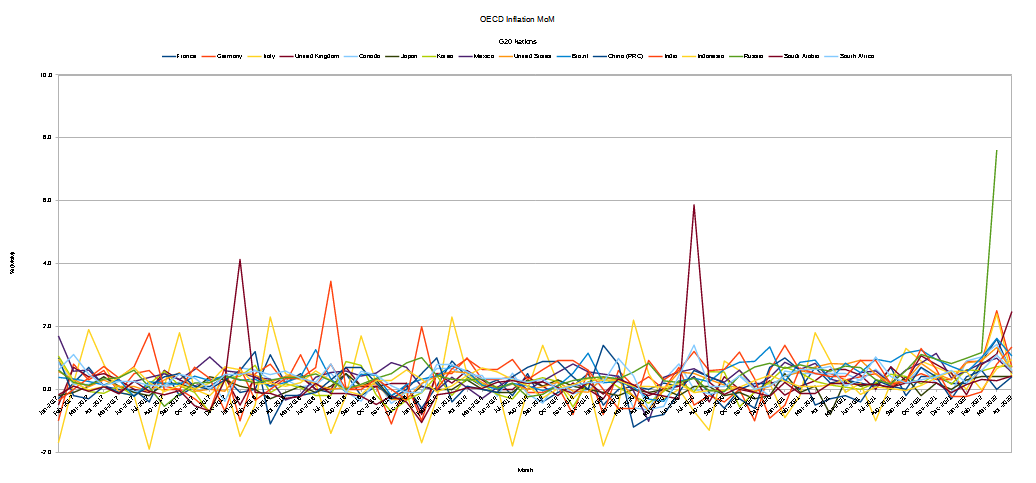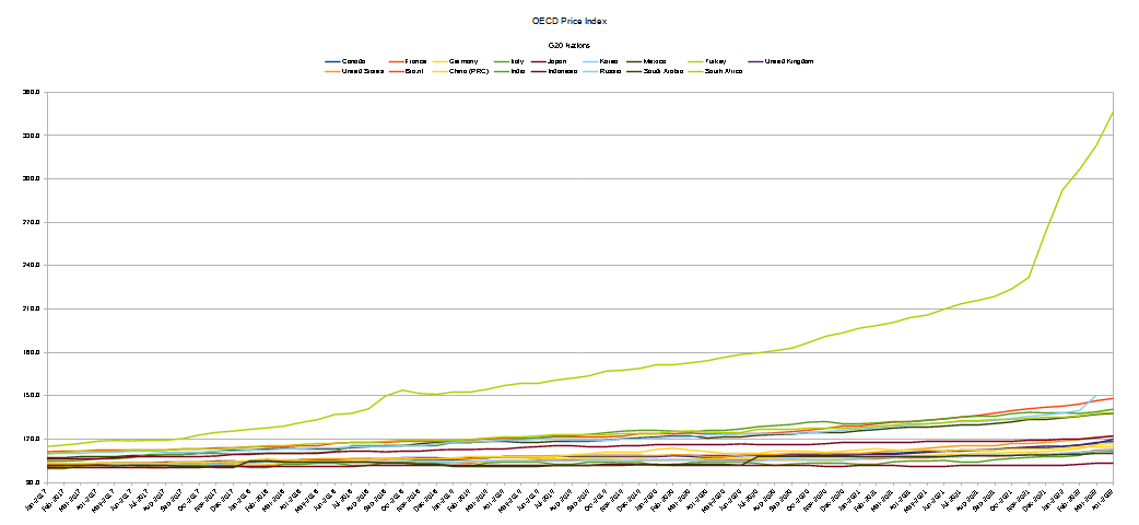 One of the few good things about entities such as the Organization for Economic Co-Operation and Development is that they are filled with bureaucrats who love to compile numbers—true manna from heaven for a geek like me who likes to look at numbers! Among the statistics the OECD makes available are the consumer price indices for the bulk of the G20 nations.