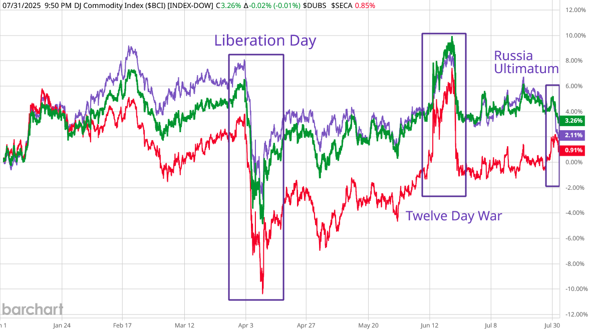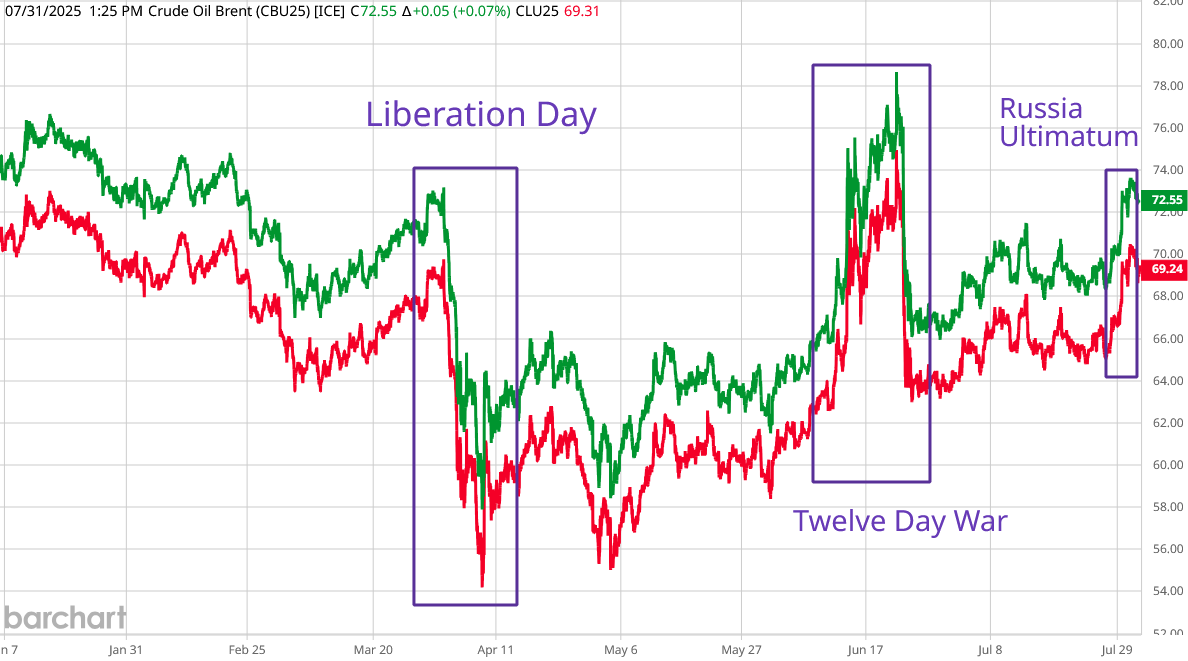 Israel’s Twelve Day War with Iran and President Trump’s Russia ultimatum on Ukraine—both non-tariff events—are two events that pushed oil prices significantly higher. Straight away we can see that energy price increases have not been due to tariffs.