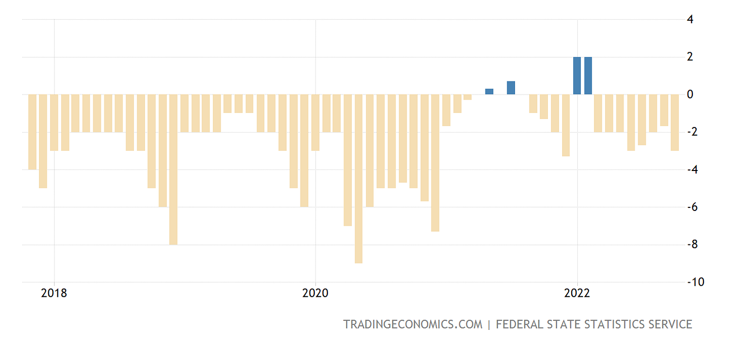 Part of Russia’s supply problems stem from the reality of Russia’s shrinking industrial output. In each of the past seven months, Russia has struggled with declines in industrial output.