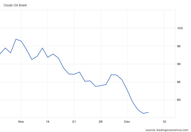It should be noted, however, that Brent crude has also been declining, although there is not a discernible acceleration in the decline on December 5. As of December 8 the settlement price for Brent crude as $76.15 per barrel.